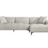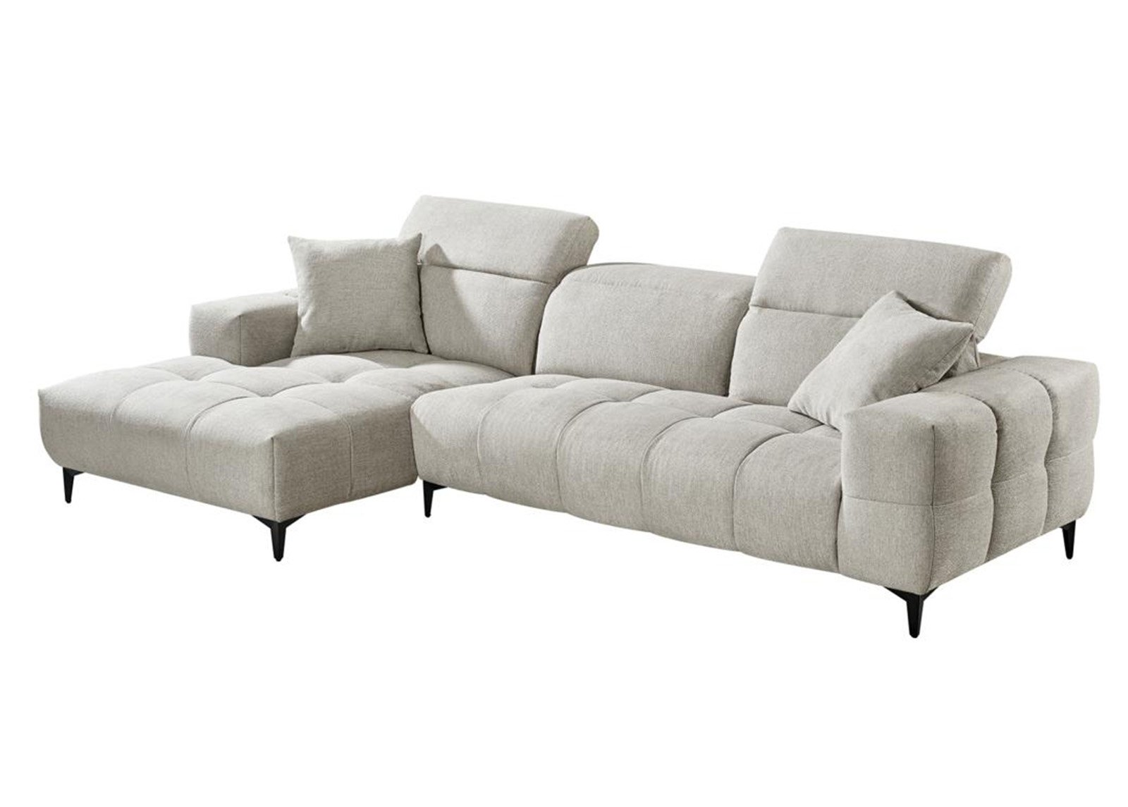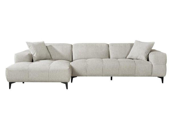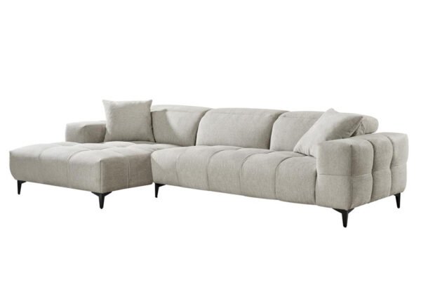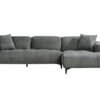 Mukava, säädettävällä selkänojalla varustettu vaaleanharmaa sohva, jonka alle on helppo siivota korkeiden jalkojen ansiosta.