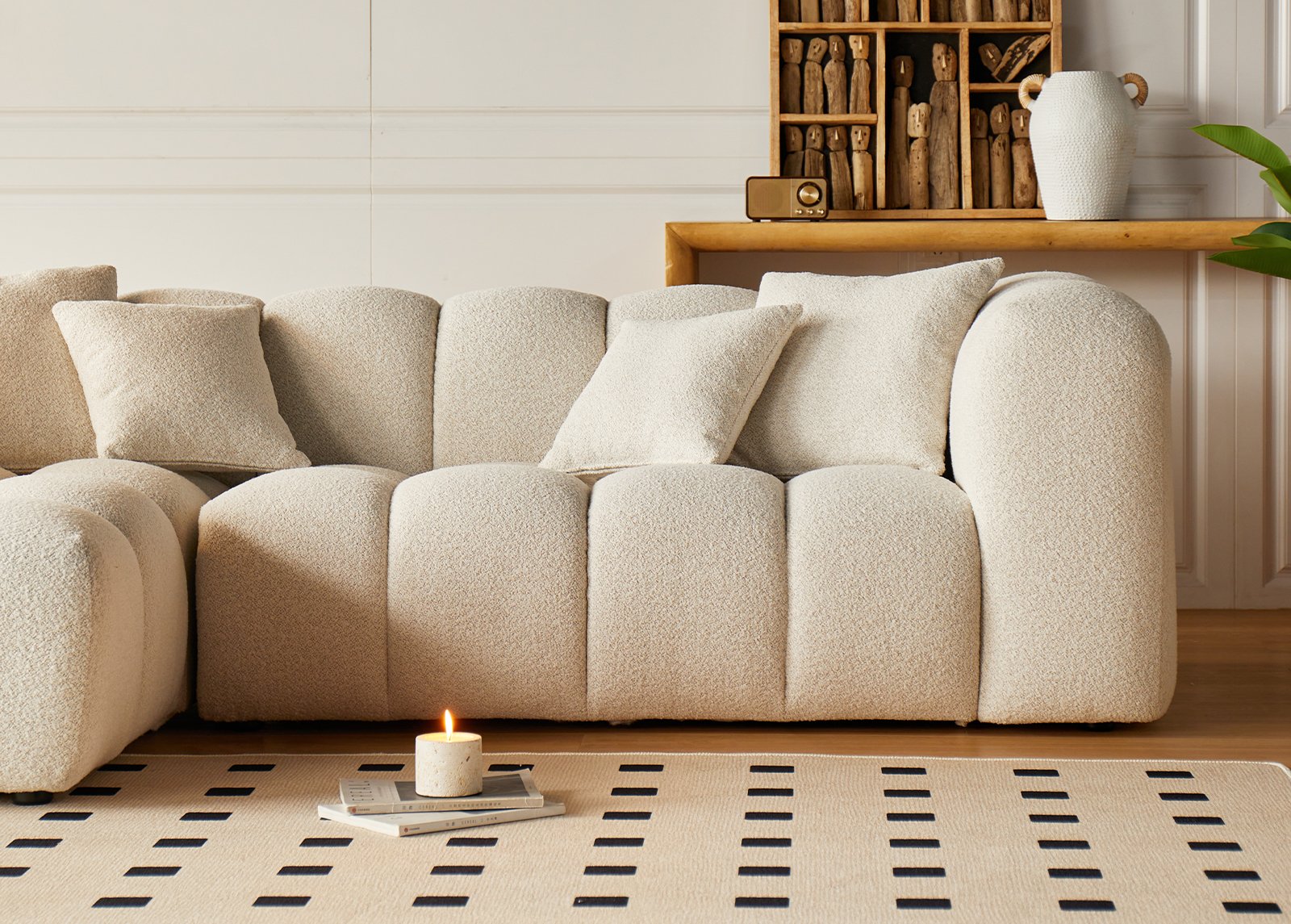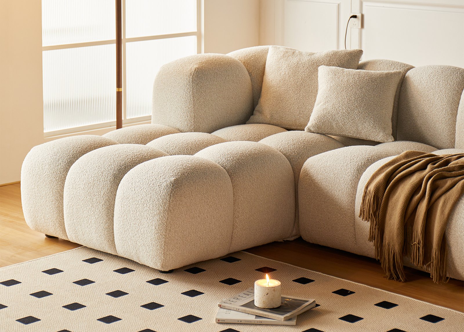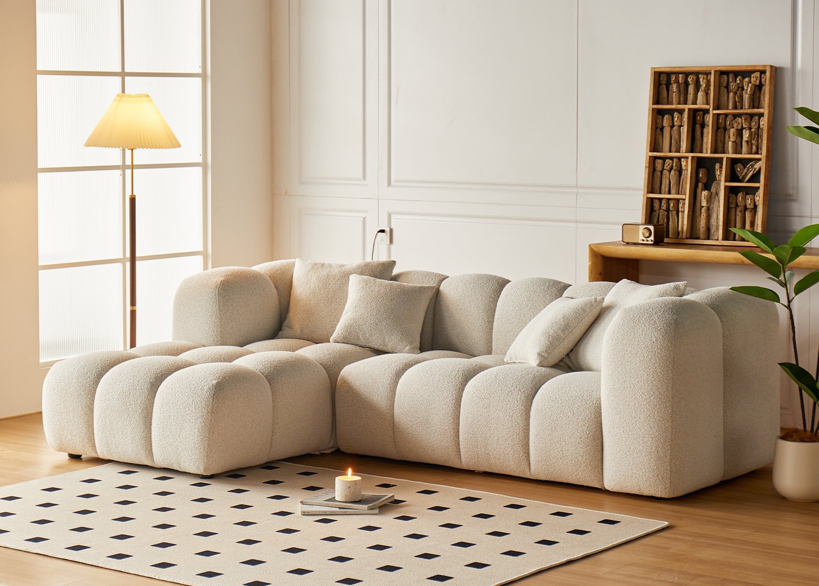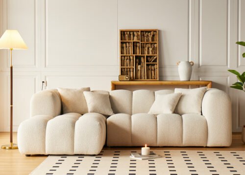 Kulmasohva LORENZO vaaleanbeige yhdistää ylellisen mukavuuden, pehmeän bouclé-kankaan ja veistoksellisen muodon luoden tilan keskipisteen, joka kutsuu lepäämään ja nauttimaan hetkistä perheen tai ystävien kanssa. Pyöreät muodot ja syvä istumamukavuus luovat viihtyisän tunnelman, samalla kun kestävä OTE Cloud -kangas takaa, että sohva pysyy kauniina ja vahvana myös päivittäisessä aktiivisessa käytössä.