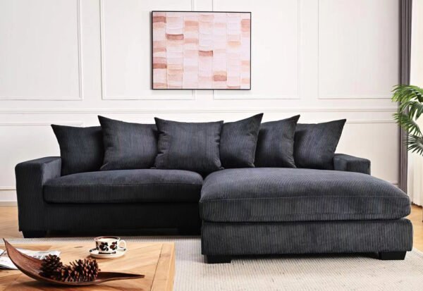 PIPER-kulmasohva yhdistää tilavan istumismukavuuden, modernin muotoilun ja kestävän materiaalin luoden täydellisen paikan koko perheen rentoutumiseen. Syvä istuinmuoto ja pehmeät tyynyt kutsuvat uppoutumaan, kun taas pehmeä uurrettu kangas lisää visuaalista tekstuuria ja musta sävy luo tyylikkään mutta neutraalin vaikutelman. Puurunko ja kestävä verhoilukangas takaavat pitkäaikaisen käytön myös aktiivisessa kodissa.