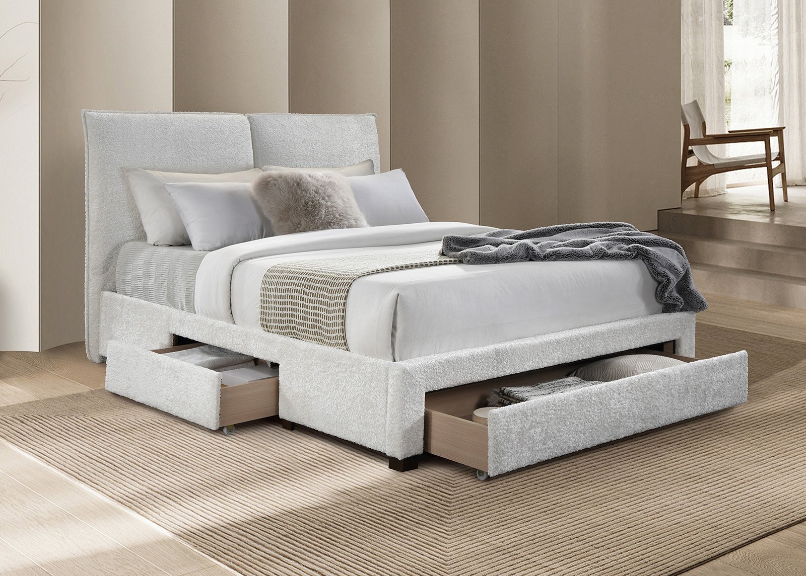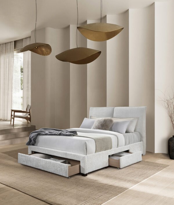 • Pohjarungon sisällä on kolme laatikkoa – yksi kummallakin puolella ja yksi suuri jalkopäädyssä (siirrettävissä pyörillä)