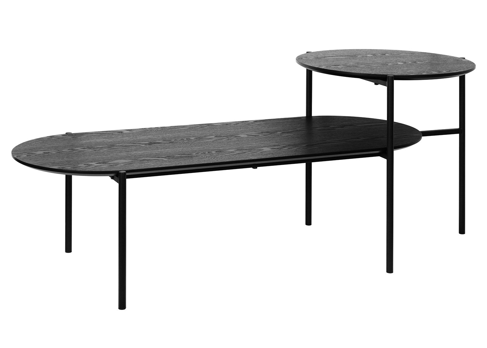 Musta sohvapöytä COLETTE tarjoaa eleganttia minimalismiä ja käytännöllistä käyttömahdollisuutta yhdessä. Kaksi-osainen muotoilu, jossa korkeampi pyöreä ja matalampi pitkänomainen pöytälevy luovat dynaamisen kokonaisuuden, sopii täydellisesti niin moderniin olohuoneeseen kuin loft-tyyliseen sisustukseen. Musta saarniviilutus lisää pöytään luonnollista rakennetta, samalla kun ilmava metallirunko pitää kokonaisilmeen kevyenä ja tyylikkäänä.