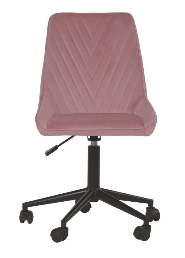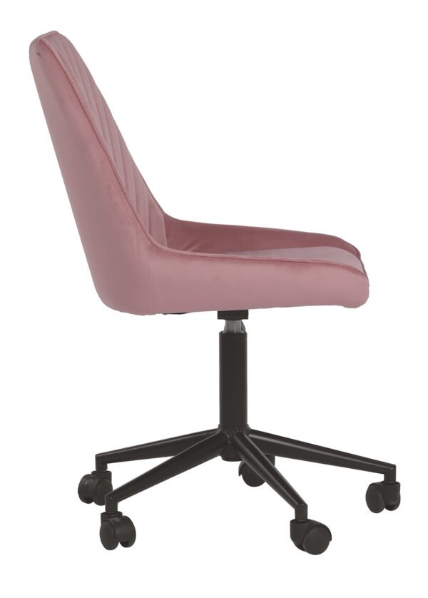 LAURA-työtuoli yhdistää modernin muotoilun ja eloisan värimaailman – vaaleanpunainen sametti antaa tuolille eloisan ja naisellisen ilmeen, joka sopii täydellisesti luovaan työtilaan tai henkilökohtaiseen kotitoimistoon.
