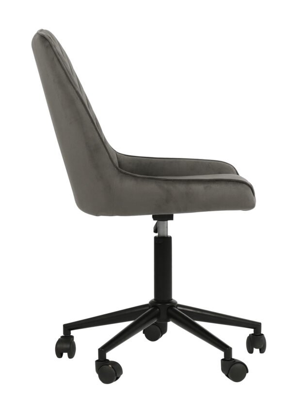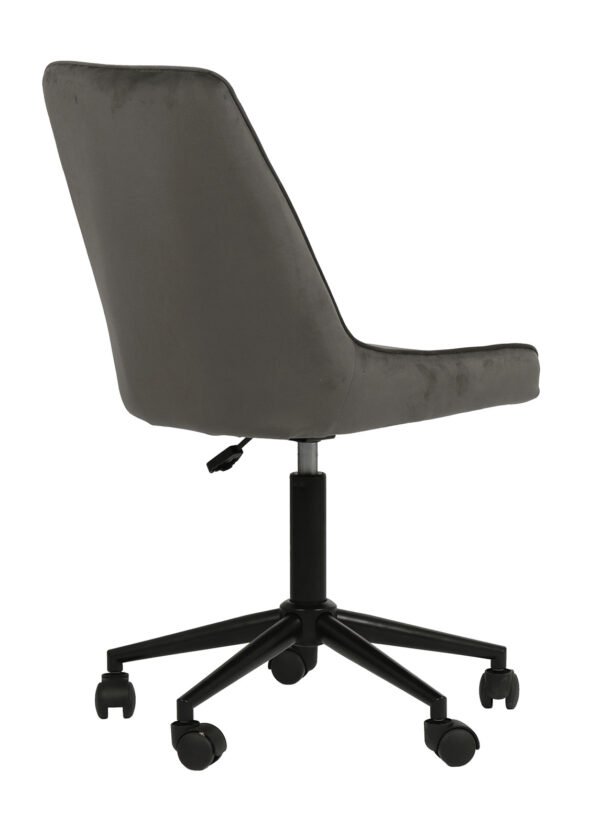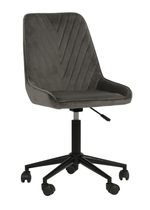 LAURA-toimistotuoli yhdistää modernin muodon ja ajattoman materiaalin – tummanharmaa sametti tuo syvyyttä ja eleganttia kontrastia sisustukseen, sopien täydellisesti niin ammattitoimistoon kuin tyylikkääseen kotityötilaankin.
