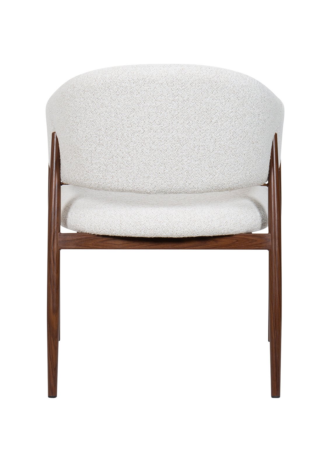 Kermanvärinen kangas lisää tuoliin visuaalista lämpöä ja rakennetta, kun taas pähkinänsävyisellä metallijalkojen viimeistelyllä on moderni, kevyt ja kestävä ilme.