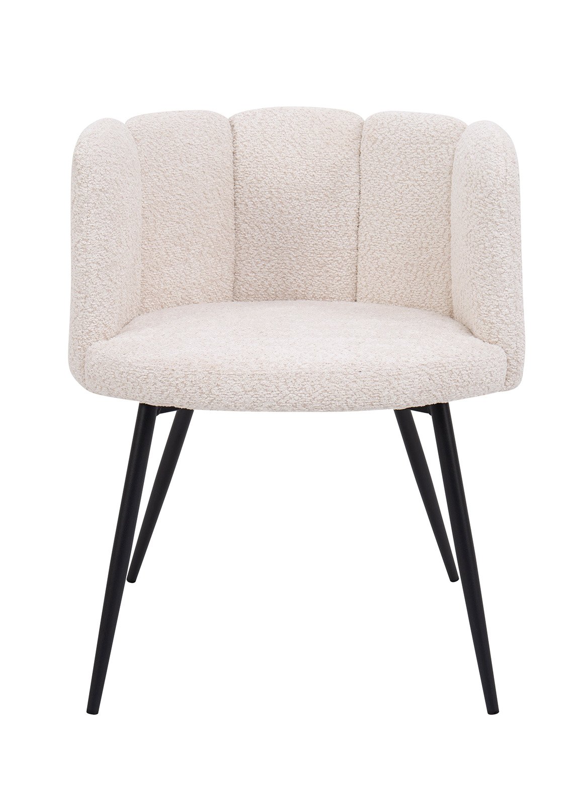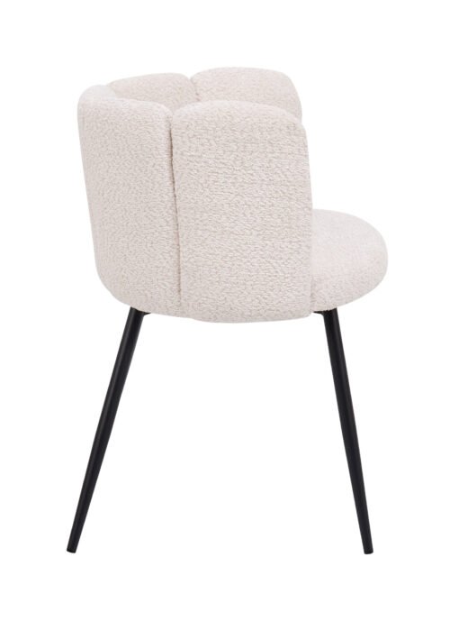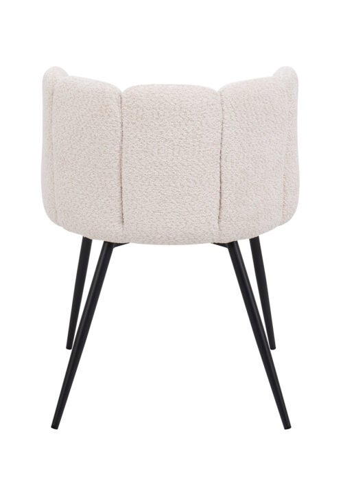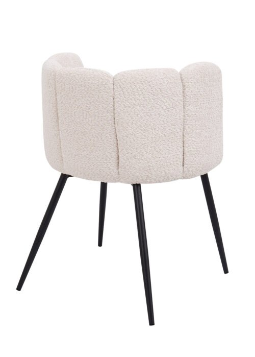 Beige buklee-tyylinen kangas luo kodikkuutta ja pehmeyttä, kun taas mustat suorat jalat lisäävät arvokkuutta ja modernia eleganssia.