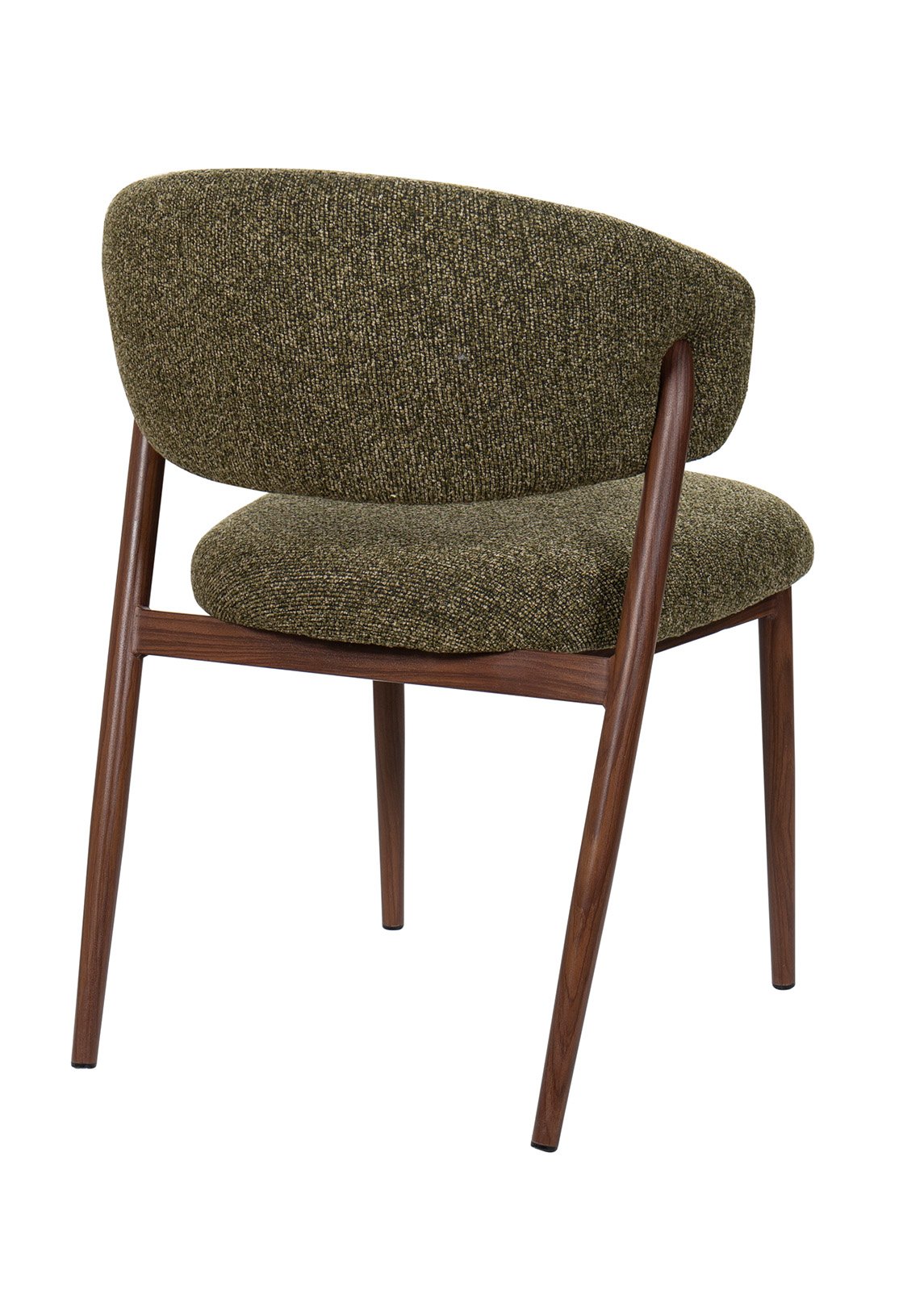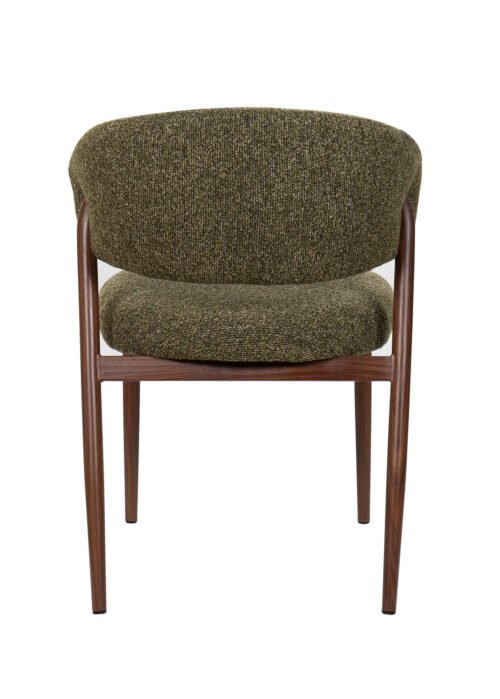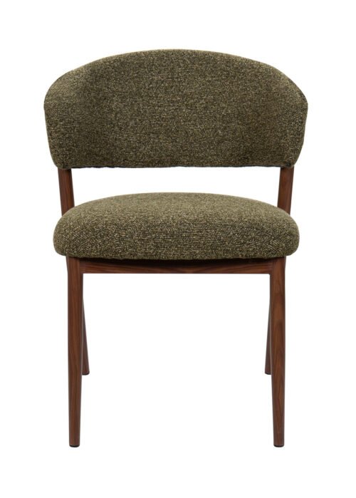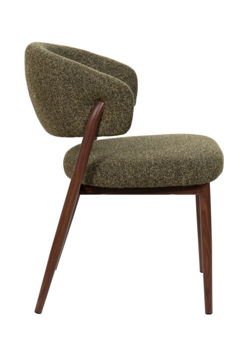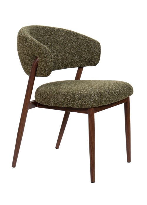 Vihreä kangas lisää visuaalista lämpöä ja rakennetta, ja pähkinänsävyisellä metallijalkojen viimeistelyllä on moderni, kevyt ja kestävä ilme.