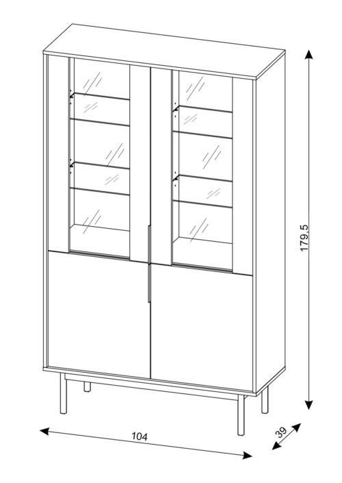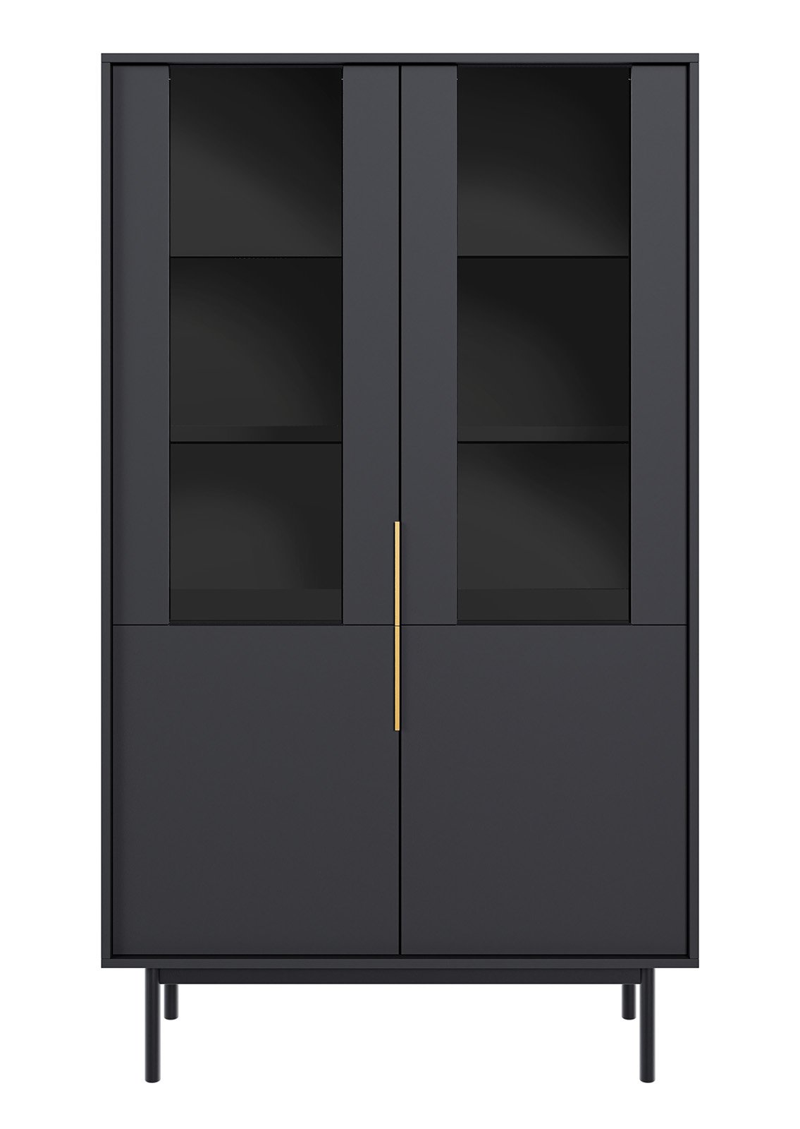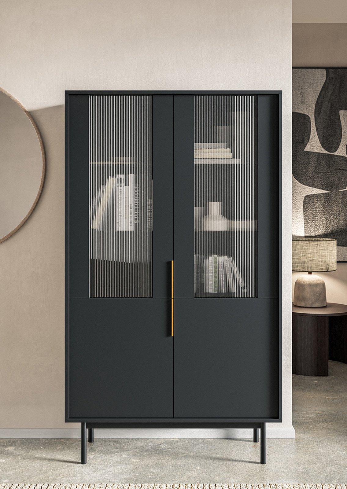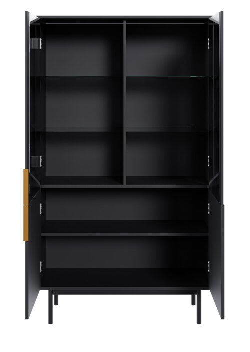 VICTORIA 5 musta vitriini yhdistää modernin tyylikkyyden ja käytännöllisen toiminnallisuuden. Korkeat lasiovet luovat ilmavan vaikutelman tilaan ja tarjoavat samalla riittävästi säilytystilaa. Pystykuvioitu karkaistu lasi piilottaa hyllyillä olevan sisällön hienovaraisesti, ja kultainen metallinen vetokahva tuo ylellisen aksentin.