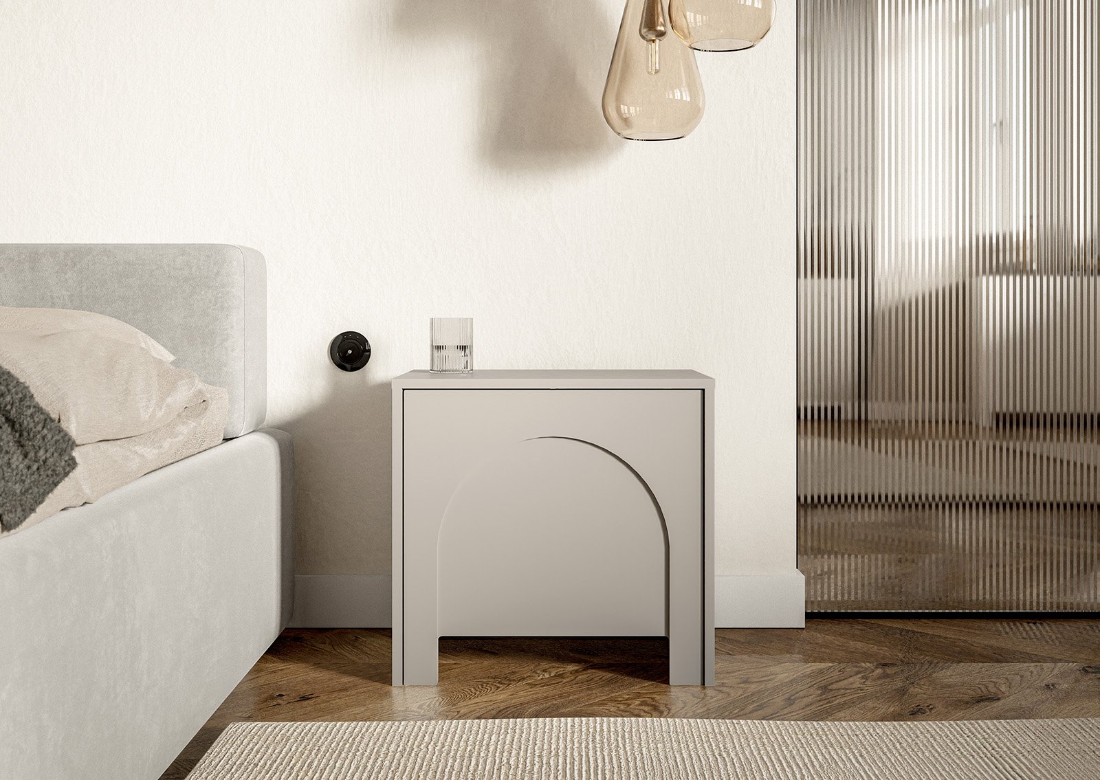 ARIANNA yöpöytä yhdistää minimalistisen muodon ja koristeellisen kaarimuotoilun, tuoden tilaan rauhallisen, mutta katseenvangitsijan aksentin. Kashmir-viimeistely ja luonteenomainen etupaneeli tuovat luonnetta sekä makuu- että olohuoneeseen.